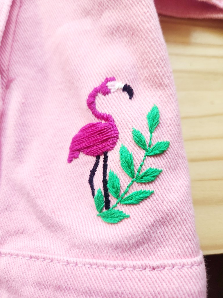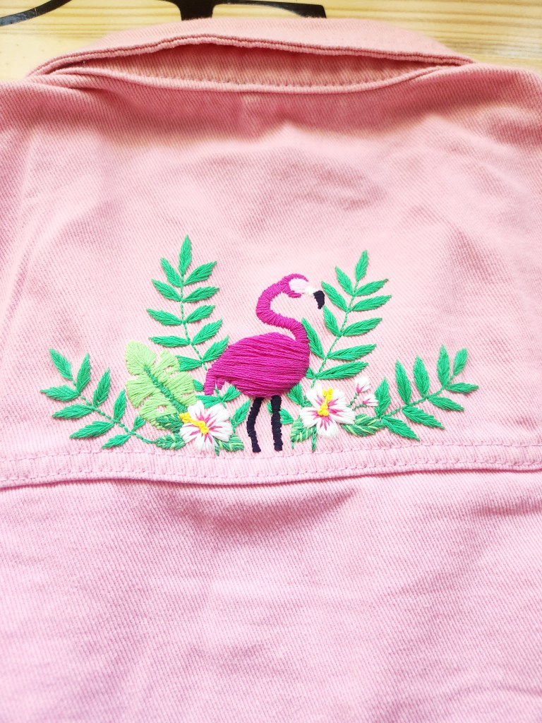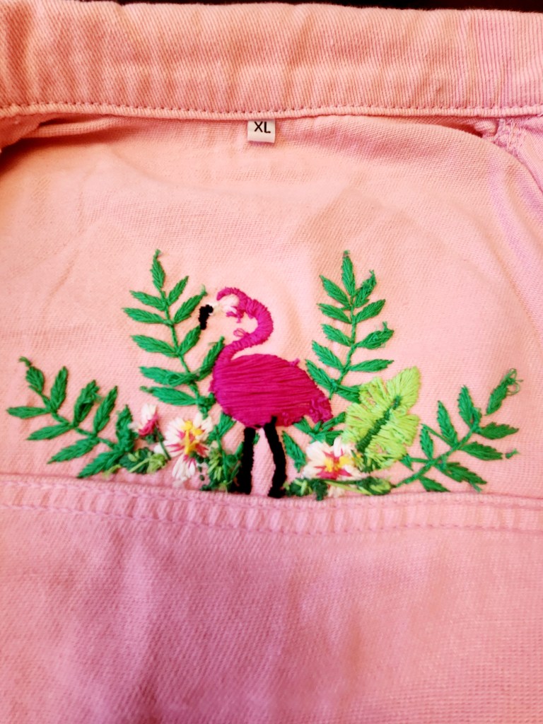Aloha to all the flamingo lovers out there! This is a hand embroidered denim jacket with tropical accents and flamingo flare. This jacket was made for one of our aunts birthdays. If you couldn’t tell she’s just wild about flamingos! So obviously that’s the theme we chose to run with.