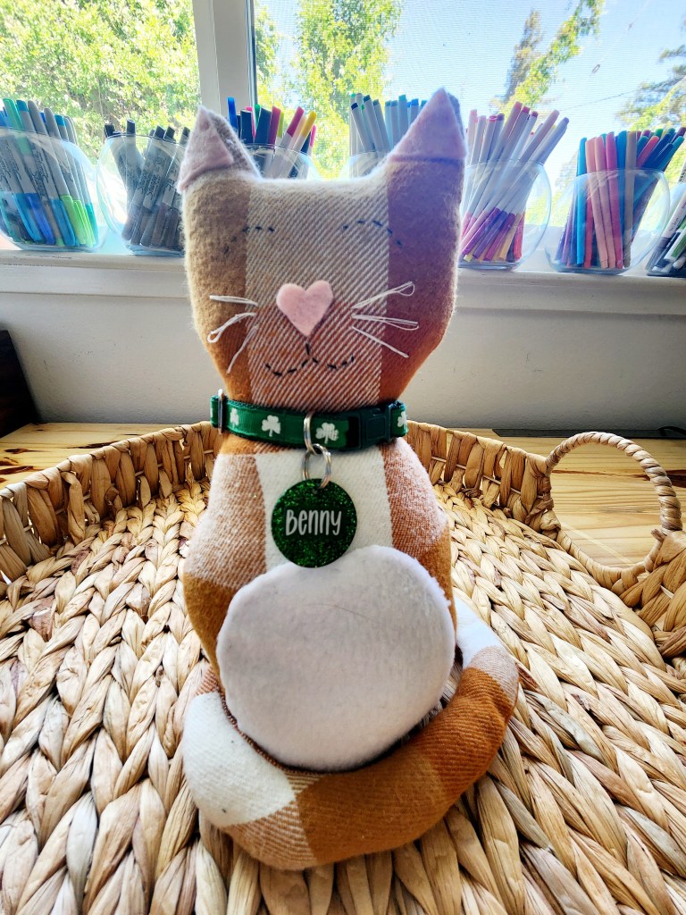 Don’t think we forgot the kitties on this one. Finding a live model willing to wear a tag was much more difficult than making the tags. Luckily, we have a stand in for such an occasion.