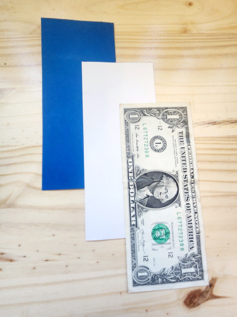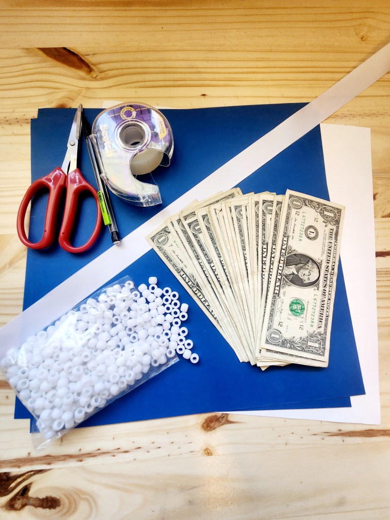 Step 2: Cut out your scrapbook pieces so they are the same size as the money. We just used one of our dollar bills and traced that. The amount you’ll need depends on how full you want your lei to be. We ended up with 12 blue and 6 white. Once they are all traced cut them out.