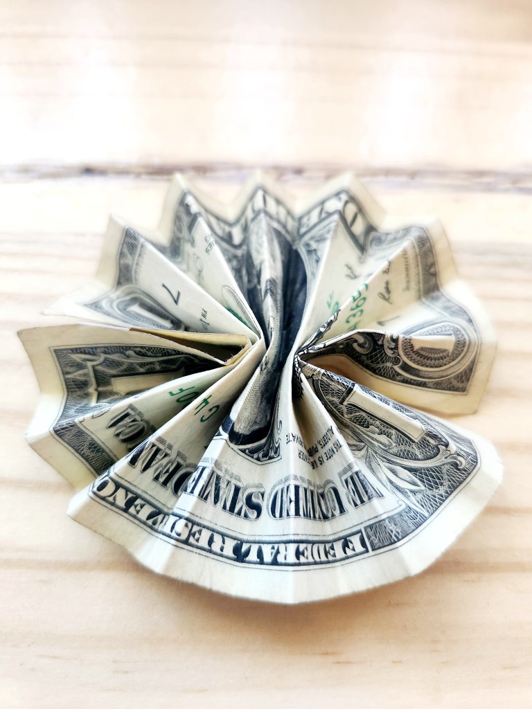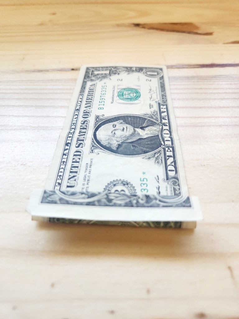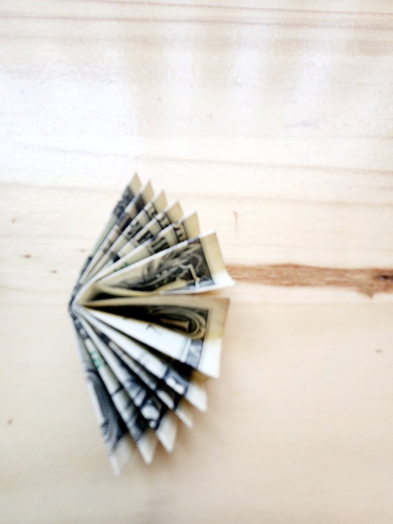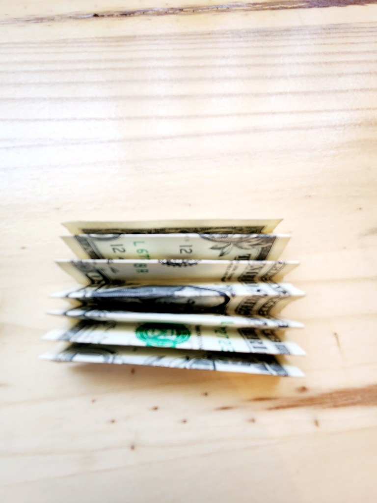 Step 3: Fold all your bills and scrapbook pieces. Your basically making sort of an accordion shape. These don’t have to be perfect. Trust us, they will look adorable once there all strung together. Make the first fold, then flip the bill over to make the next fold. Repeat the process until you end up with a little accordion. Do the same thing with all your money and scrapbook pieces.
