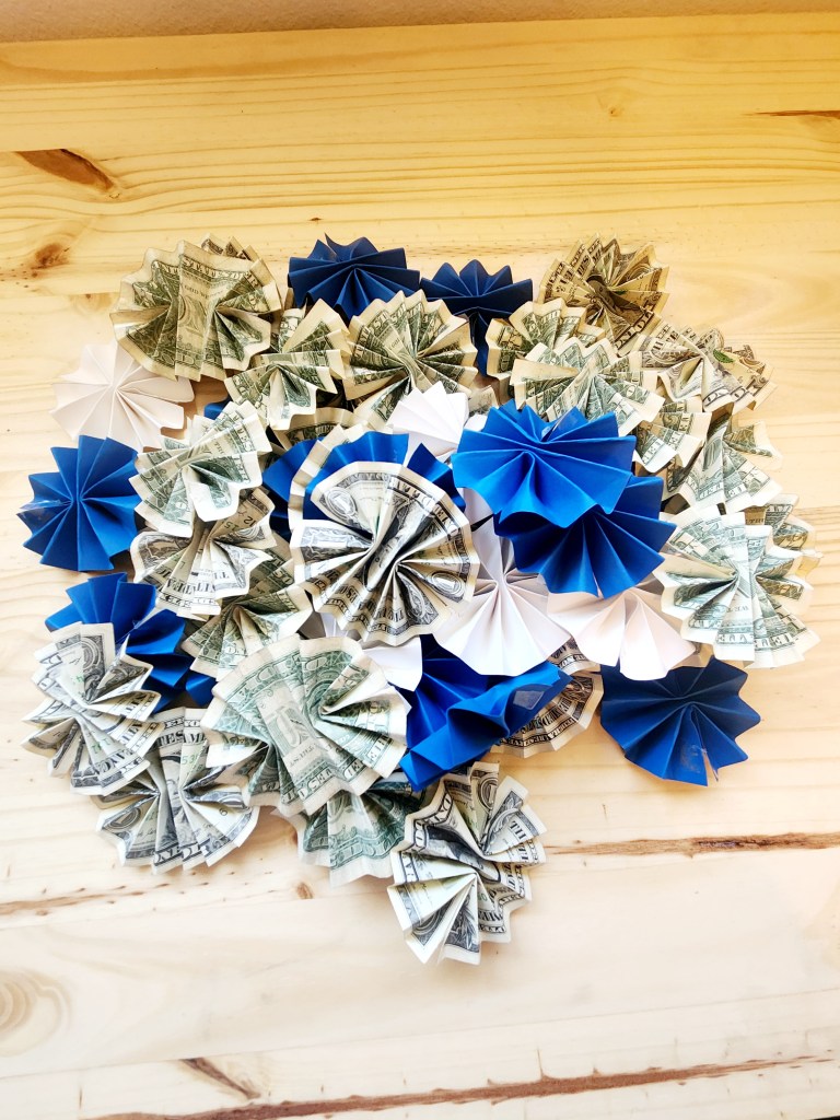 Step 4: Now you’re going to take your accordions and fold them in half. You’re going to be taping each side so that they make a flower shape. Use the outside folds on each side and place a small piece of tape to keep them together (don’t go crazy with the tape… you want the grad to actually be able to use the money at some point). Repeat with all your money and scrapbook pieces.