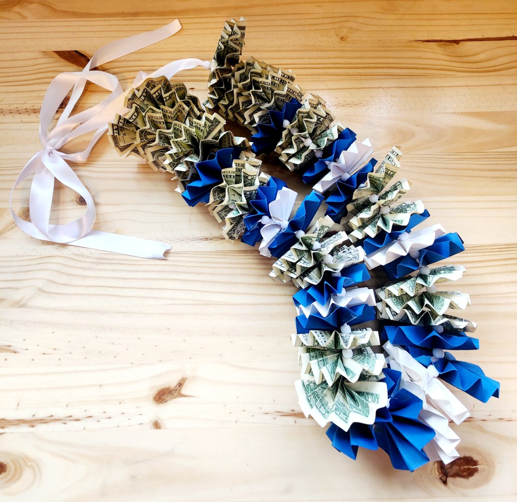 -Money ( this works with any bills $1, $5, $10, $20 etc. ) so use how ever much you want to. It just depends on how generous you want to be. The more volume of bills the fuller your lei will be. So using a mixture of different denominations works best.