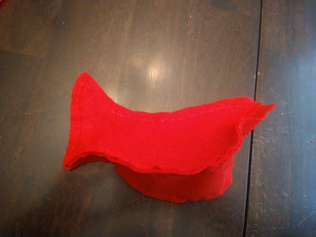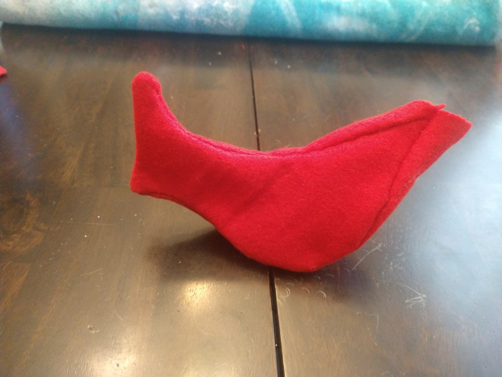 This was surprisingly easy, except for the belly piece. It’s going to be longer then the side piece to accommodate for the curve of the belly. You can take the stencil of the side piece and roll it along to see how long the belly needs to be to go from the tip of the tail to the tip of the beak. Also in doing the wings, if you want them stiff like the doves then you’ll need to accommodate the felt so it will wrap around the cardboard pieces. This same idea was used on the cardinals tail so it will stick out without flopping over.