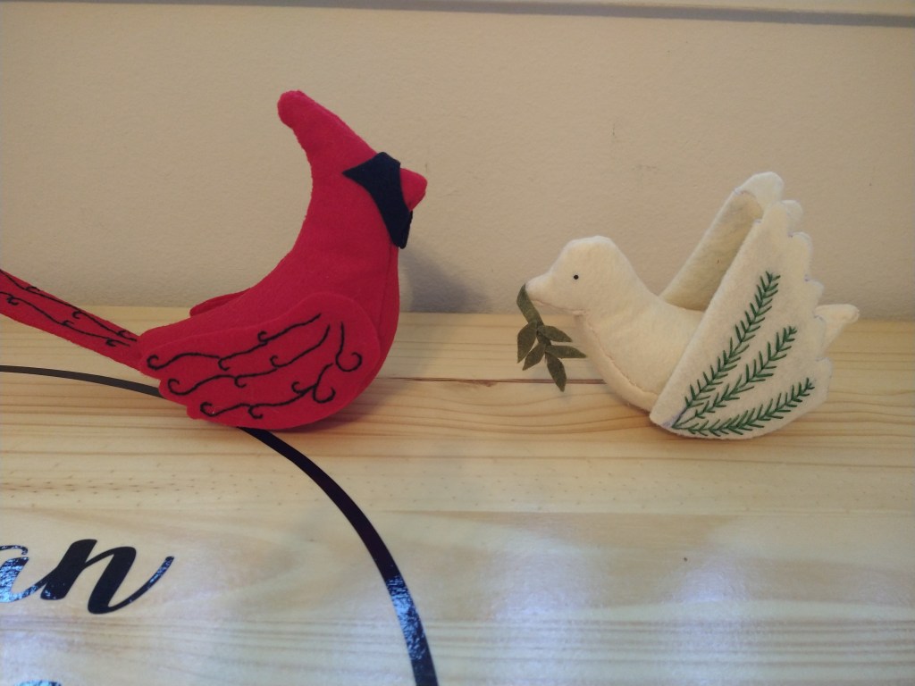 We each took our time to make our birds a little extra special and added some simple embroidery. The dove got its wings done in a cute leaf / vine pattern. The cardinal some festive swirls on the wings and along the tail. This isn’t necessary but just look how cute they came out. Keep in mind that your wings will be opposite directions of each other as they go on opposite sides of the bird. (Don’t ask how many times a wing had to be redone.)