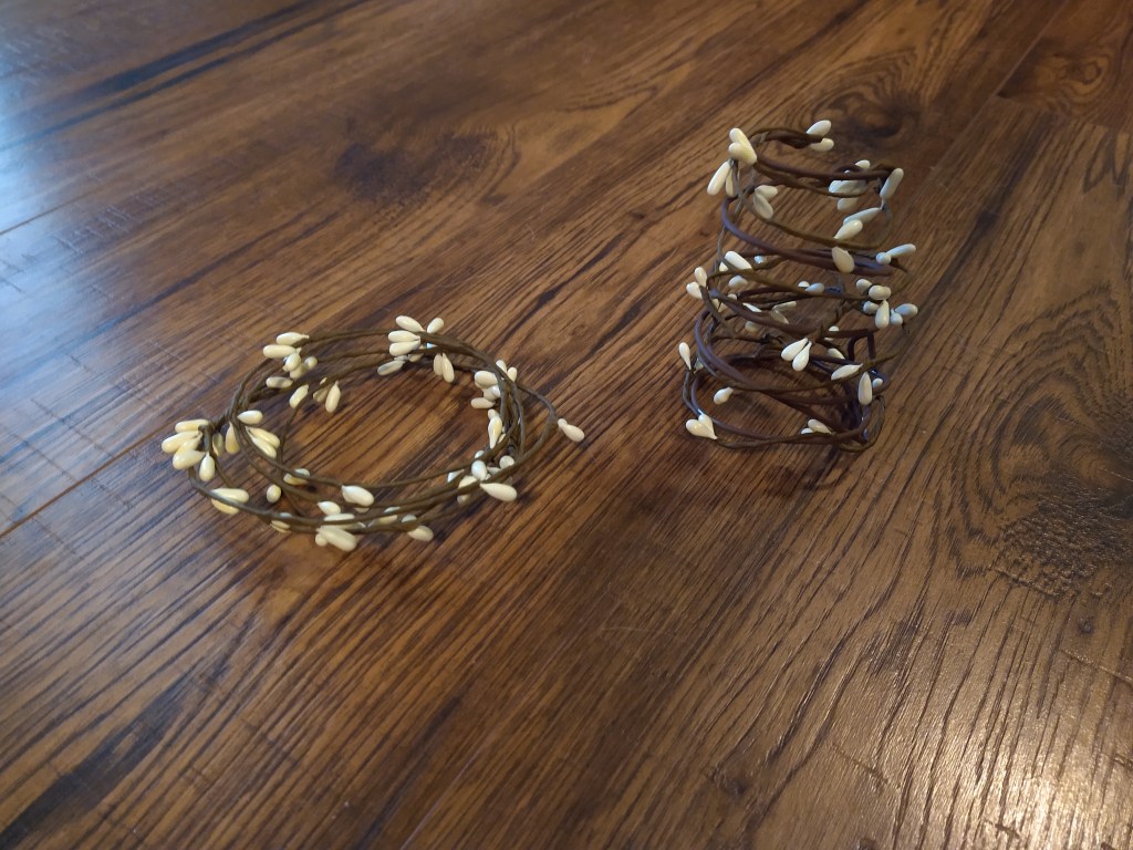 Using your wire ( or flattened out clothes hanger) make a spring shape that is smaller at the top and wider at the bottom. It helps to wrap it around a round object to make it smoother but don’t worry too much about it since its supposed to be natural looking. We then painted it brown using some cheap acrylic paint to match the wire ribbon we had but its not strictly necessary. Once its dry wrap the cute little brown wire ribbon around the spring. Add as much or as little as you like. We found cutting it in sections of a foot or so helped it from tangling in the spring. Use a little hot glue to hold the ribbon in place if its not staying well just by wrapping it.