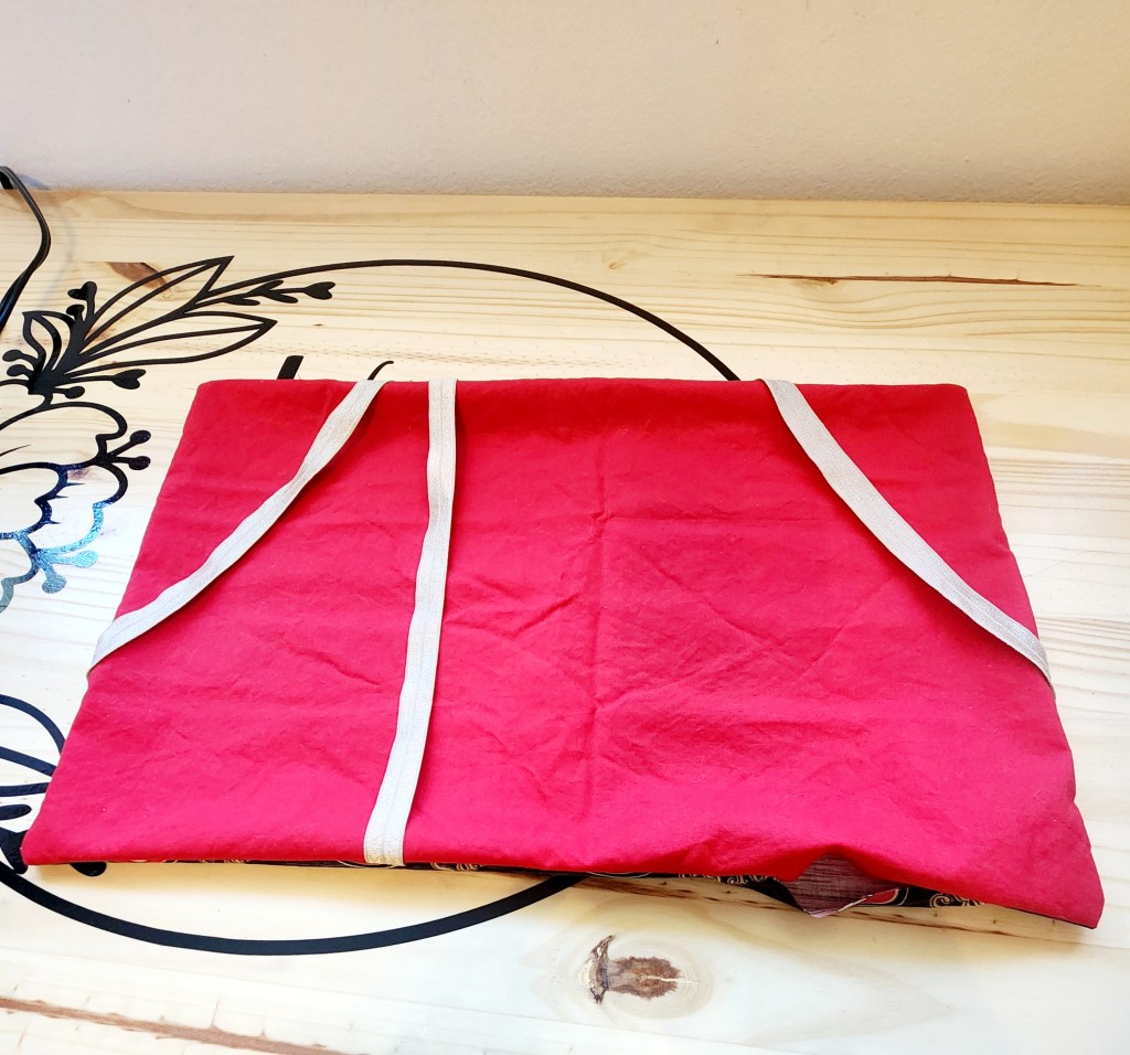 Using one of your 12” long elastic pieces place one end 5.5” from the top left of your pillow and the other end at 9” down the left side of your pillow. Now with the other 12” long elastic piece you need to do the same thing on the opposite side. Place one end at 5.5” from the top right of your pillow and the other end at 9” down the right side of your pillow. The third piece of elastic goes straight towards the center of your pillow at 7”. It should be a bit more to one side to allow for a book to slide in place. Keep in mind when pinning your elastic that depending on the size of the books you may want to move your elastic more in. Our measurements are better for hard cover books but may not work for paperbacks.
