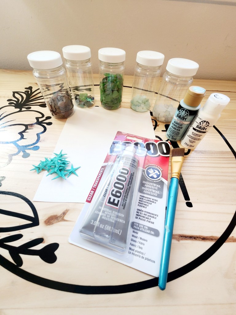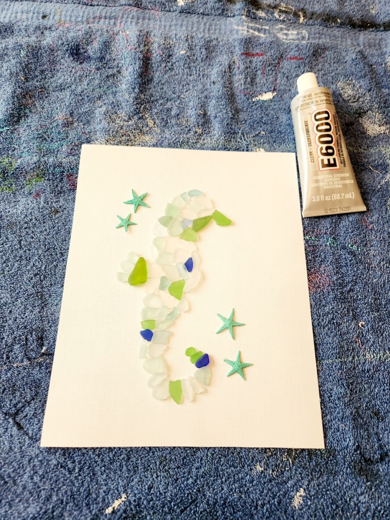 Step 5: Glue your sea glass to your scrapbook paper. We like to put a towel or drop cloth down for this step ( we have quite the collection of “craft towels”). You will need to pick up each piece of glass one by one and glue it down. The E6000 adhesive is a little tricky to work with. It’s not so much the glue itself that’s difficult, in our experience it’s more poor packaging. It kind of oozes out while it’s open, so just be mindful of that. We like to use a toothpick to pick up a little bit of adhesive and spread it on the back of the glass. This helps you have more control over how much glue your using at a time. It takes a little while to dry so you’ll have a little bit of time to adjust any pieces that you need to.