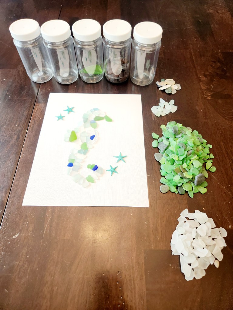 Step 4: Lay out your sea glass. There is no wrong way to do this. Use as many colors and shapes that feel right to you.