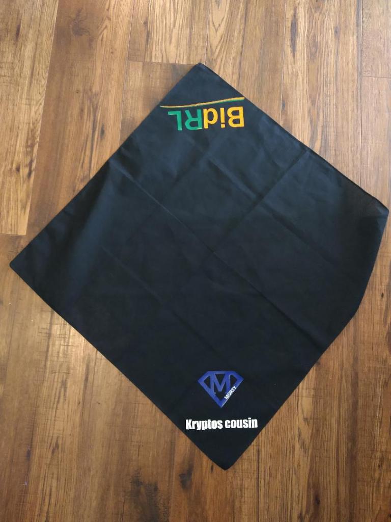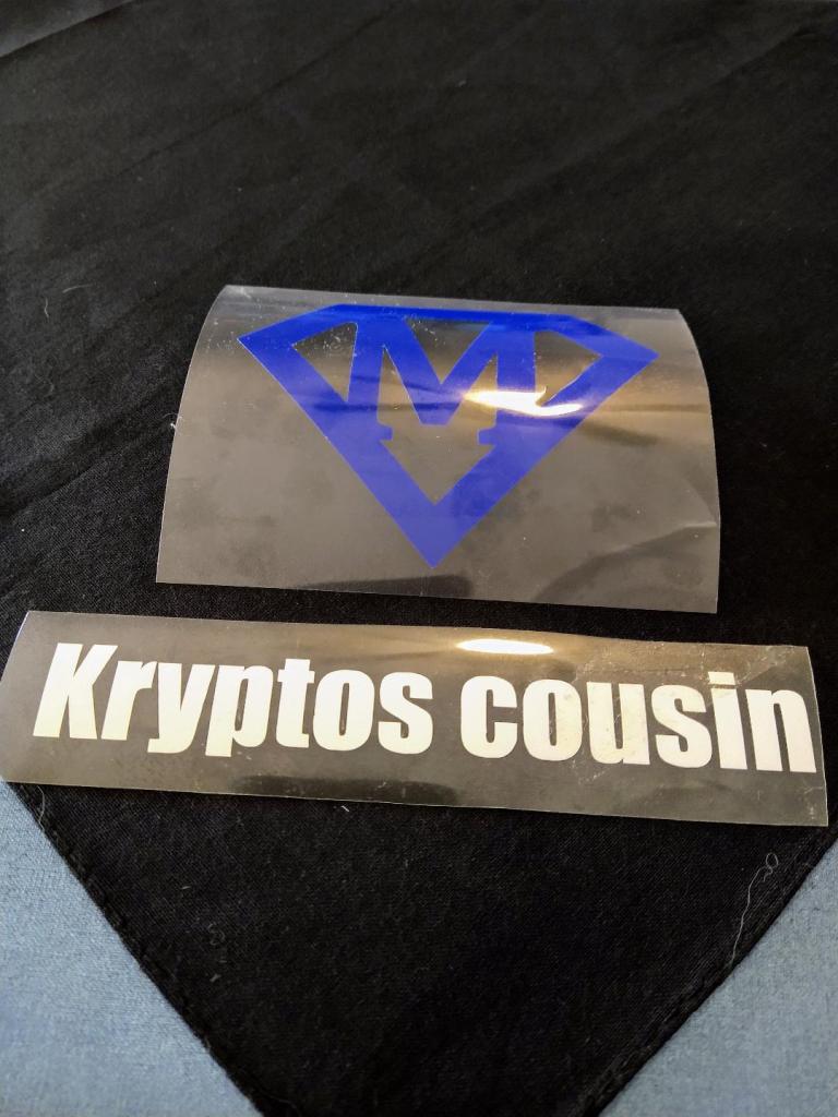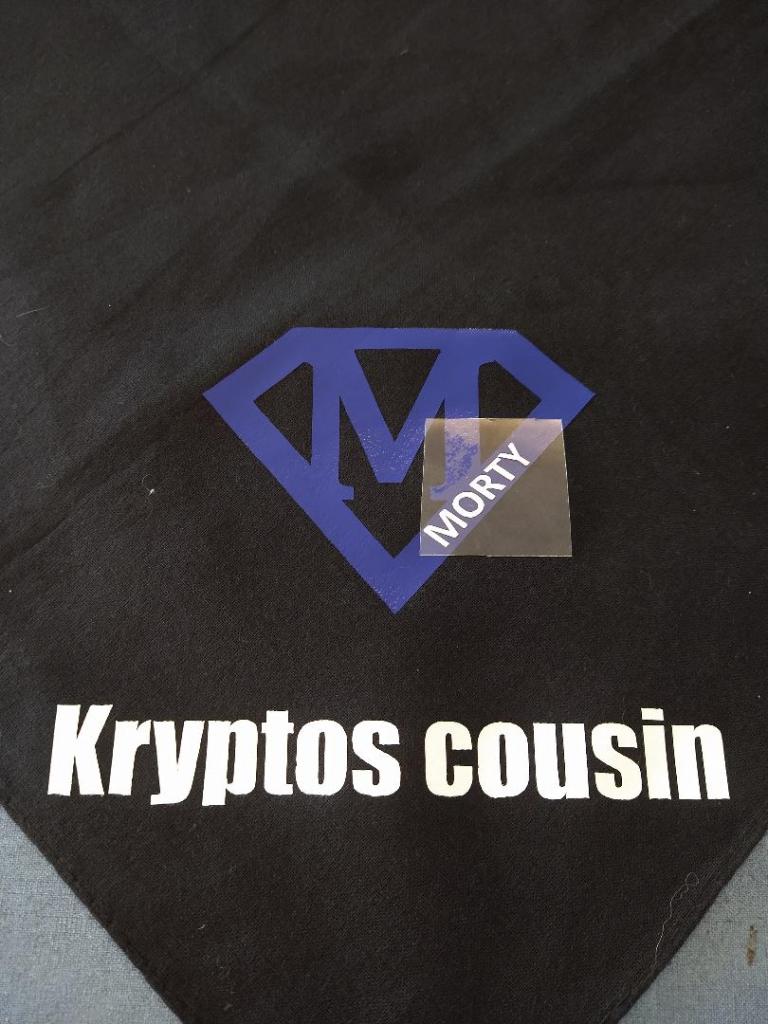 Every pup needs a few cute bandanas in their wardrobe for holidays and special occasion. Well in this case its because we thought the husbands and their friends would get a kick out of it. By making them double sided you use less bandanas and just as importantly have less to store. Since we made a cute one for hub we decided to make one with the name of local business we go to ( they LOVE dogs).