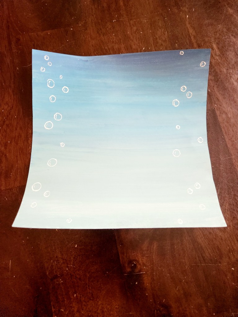 Step 7: Create a background. You will be using the scrapbook paper or poster board for this. You can leave it white so your pet will be the center of attention ( as they should be) or paint something on it ( like we did) or you could even draw something with markers. Whatever you do will be adorable! If you choose to paint on it the paper has a tendency to curl up. But, don’t worry the glass is heavy enough to weigh it down so it will sit flat.
