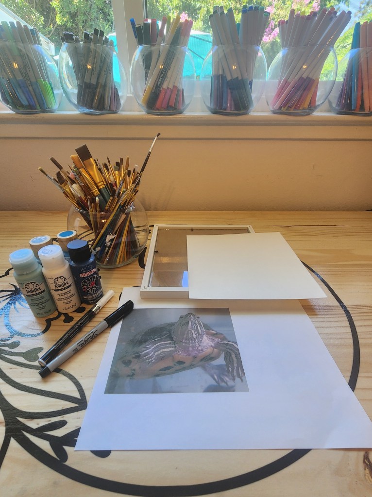 Step 4: Use your thin tipped black marker and trace your image. This is where you are going to be using your imagination. You will want to trace the general outline of your image and any other characteristics you want to highlight ( such as eyes, nose, paws, ears, etc.) We also added a bit of texture by adding some stippling and lines with our white paint pen. This is completely optional. It’s up to you how detailed you want to get. There isn’t a wrong way to do this. Keep in mind everything you draw with pen in this step will be on the front of your portrait. So, if you want to add any fur lines, whiskers or freckles ( obviously this doesn’t apply to this sweet turtle) you will want to add it here before you paint over top of it.