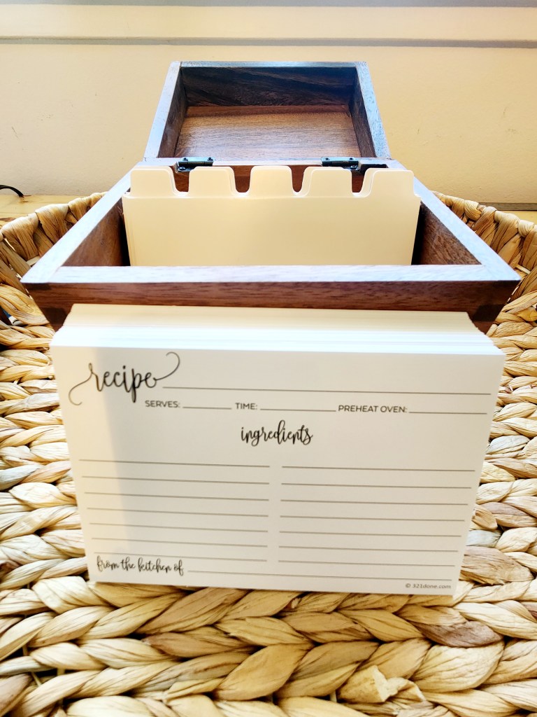 -The correct sized recipe cards to fit in your box. The box we purchased happens to work for 3X5 and 4X6 but we opted for the larger sized cards for more writing space.
