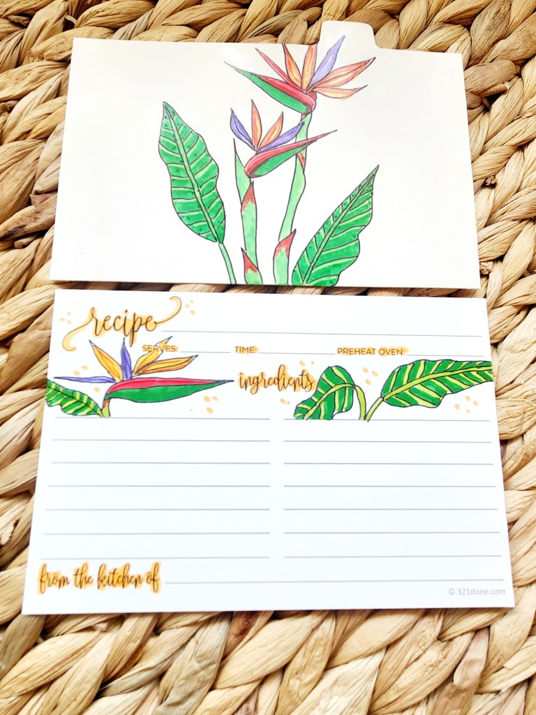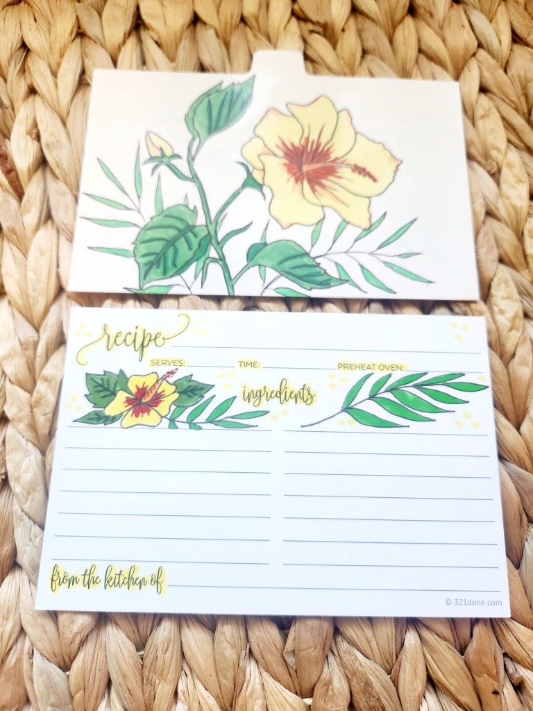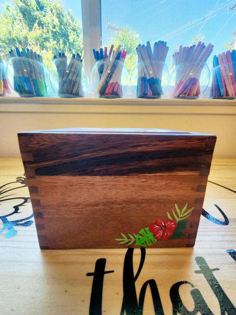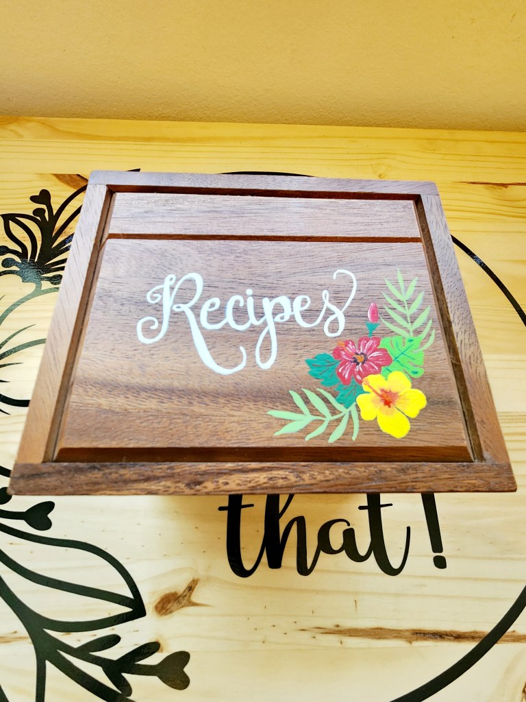 This is a customized recipe box designed for one of our family members. She loves Hawaii and tropical designs and colors so that’s the vibe we were going for. We plan on decorating the recipe cards and identifying tabs with markers and using acrylic paints to embellish the exterior of the box itself.