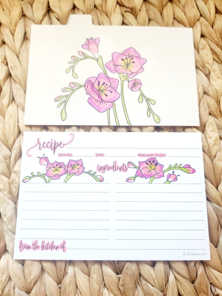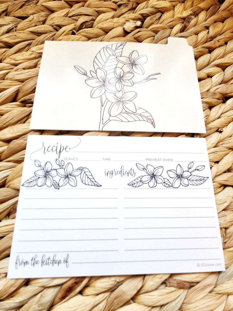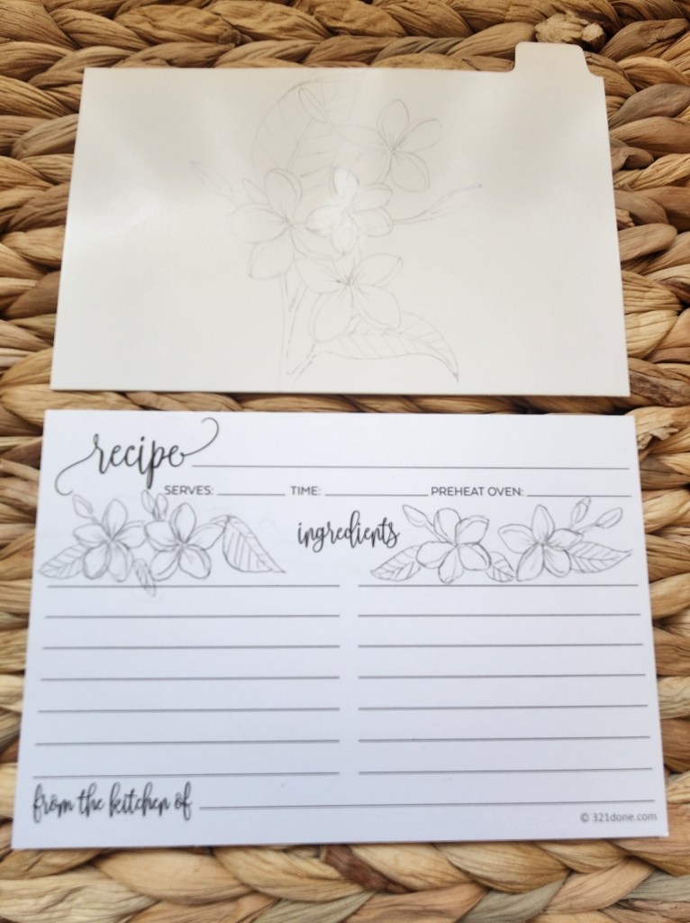 Step 3: Design your recipe cards and identifying tab cards. Since the pack of recipe cards we ordered is a pack of 50 we knew we would want several variations of flowers to add more interest. We like to draw out the design with pencil first, this allows for mistakes along the way.