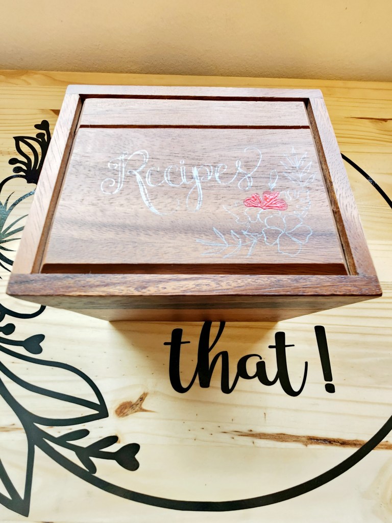 Step 6: Once you have your recipe cards and identifying tab cards done and how you want them it’s time to move on to the box. We are going to use acrylic paints so it really stands out on the wooden exterior.
