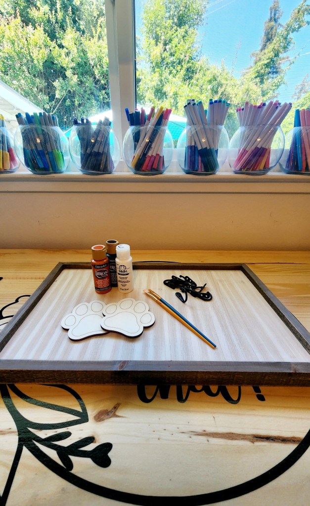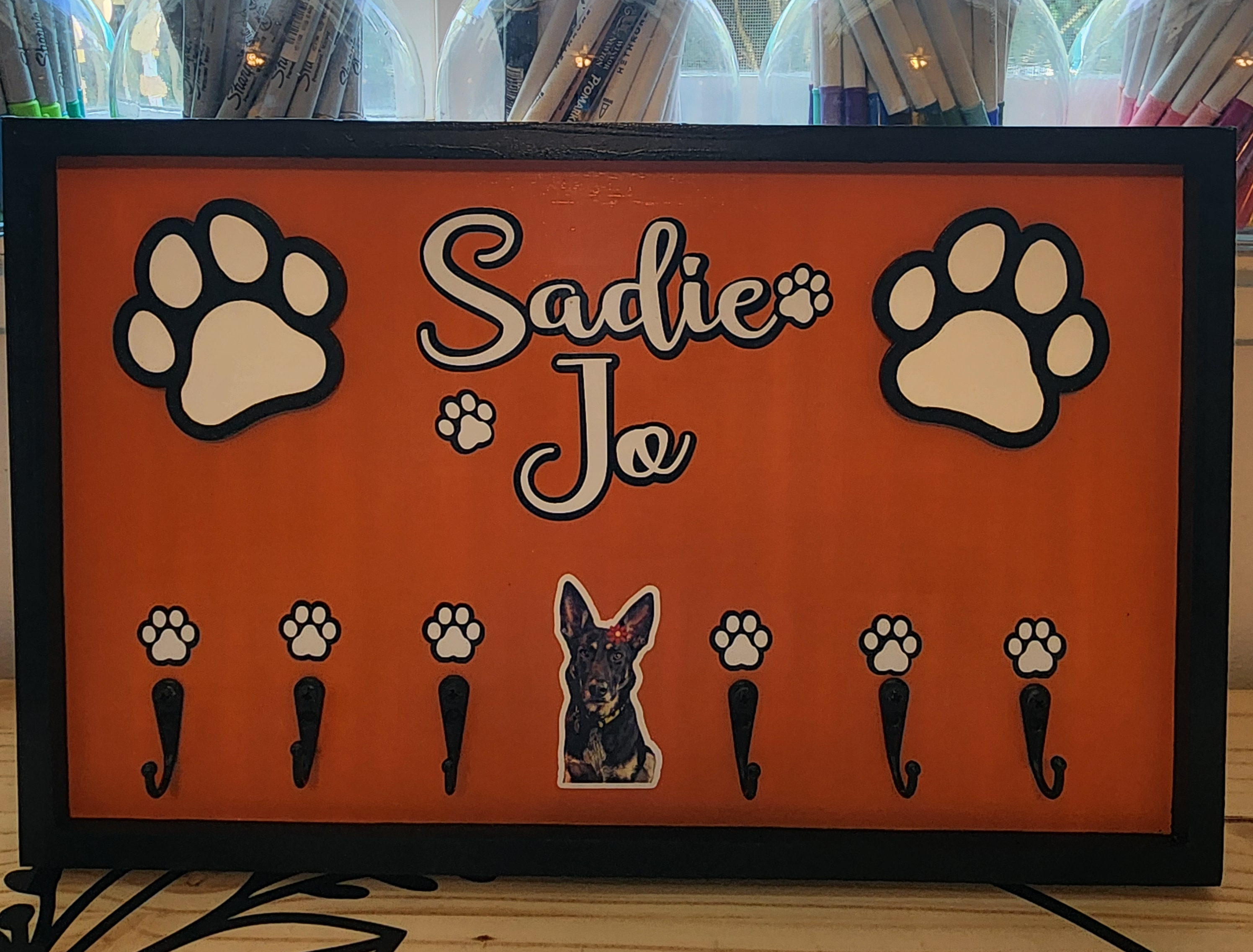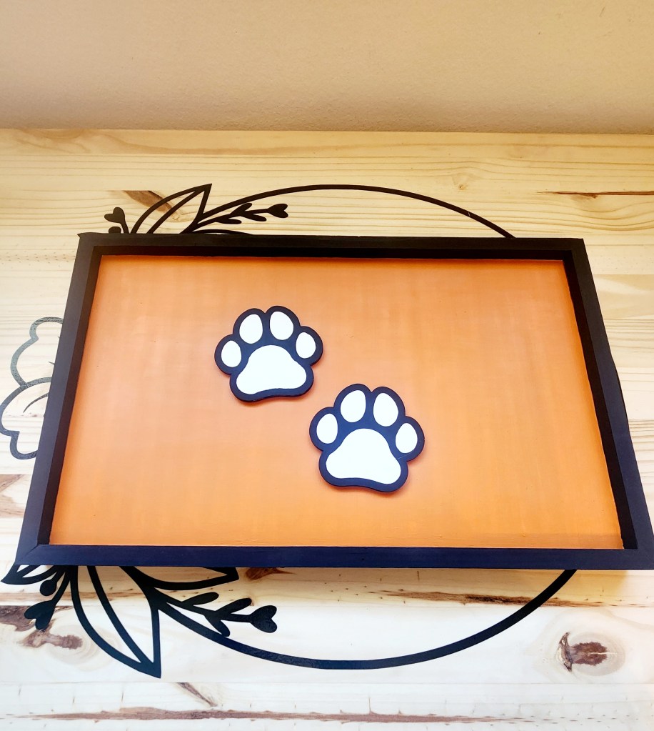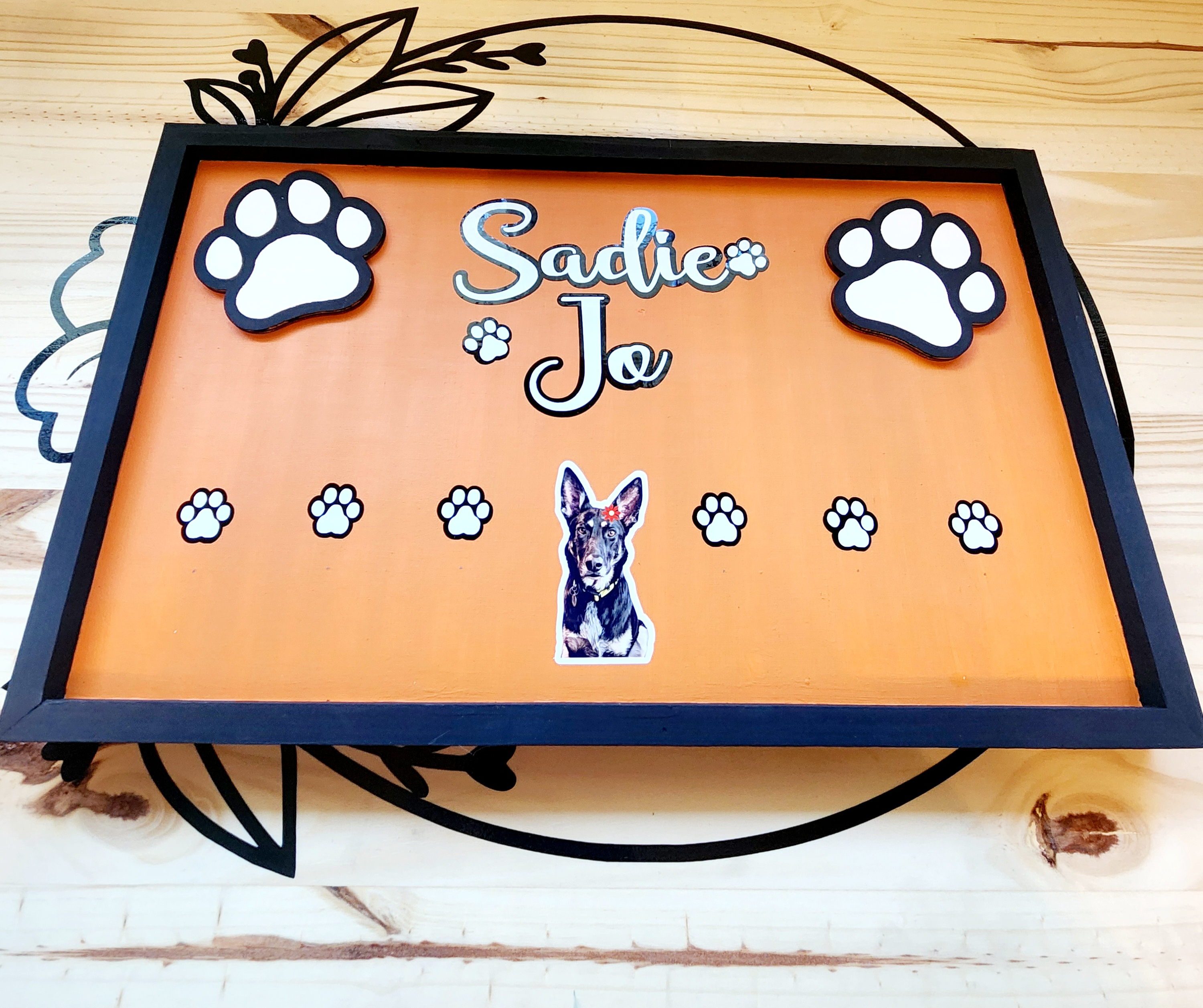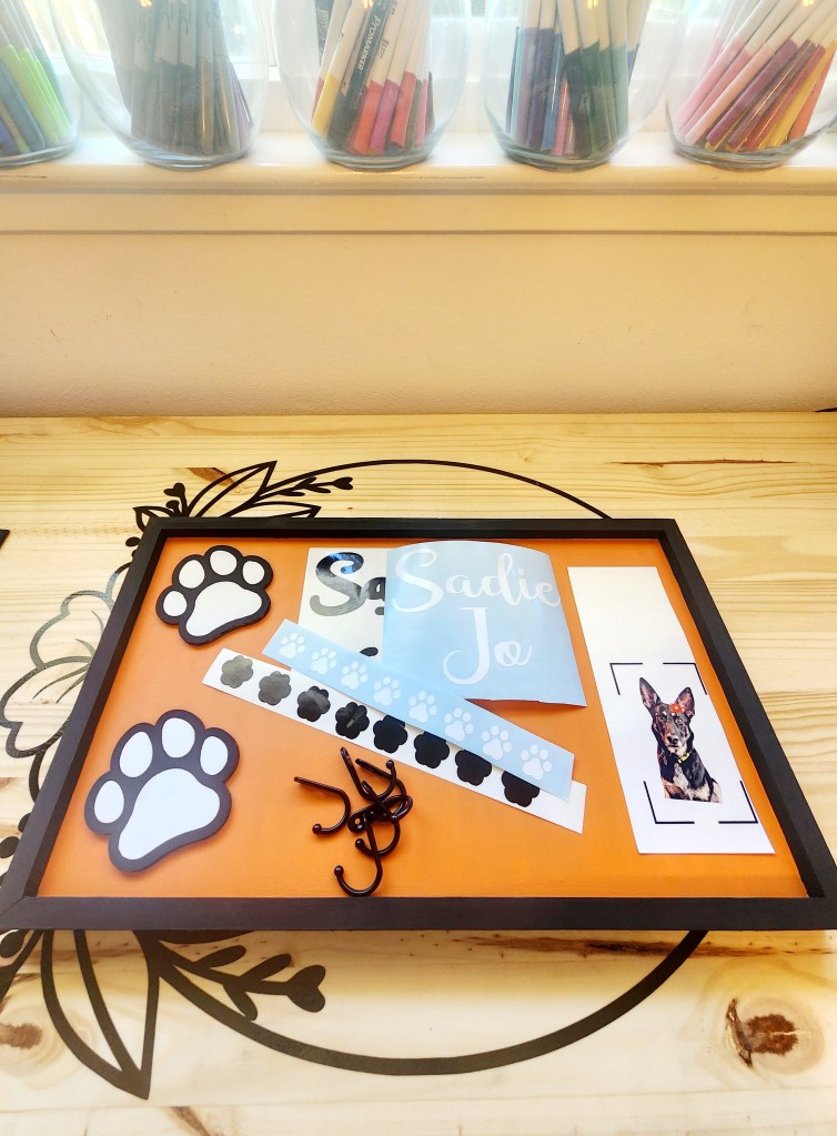 Step 3: Plan out your decor placement. In our case we used our cricut machine to print out a photo of Ms. Sadie Jo and her name. We also printed out some little paw prints for some extra cuteness.