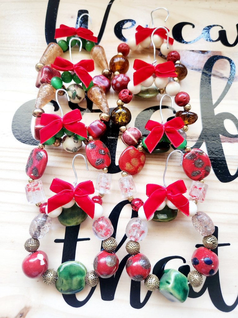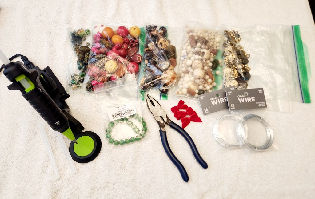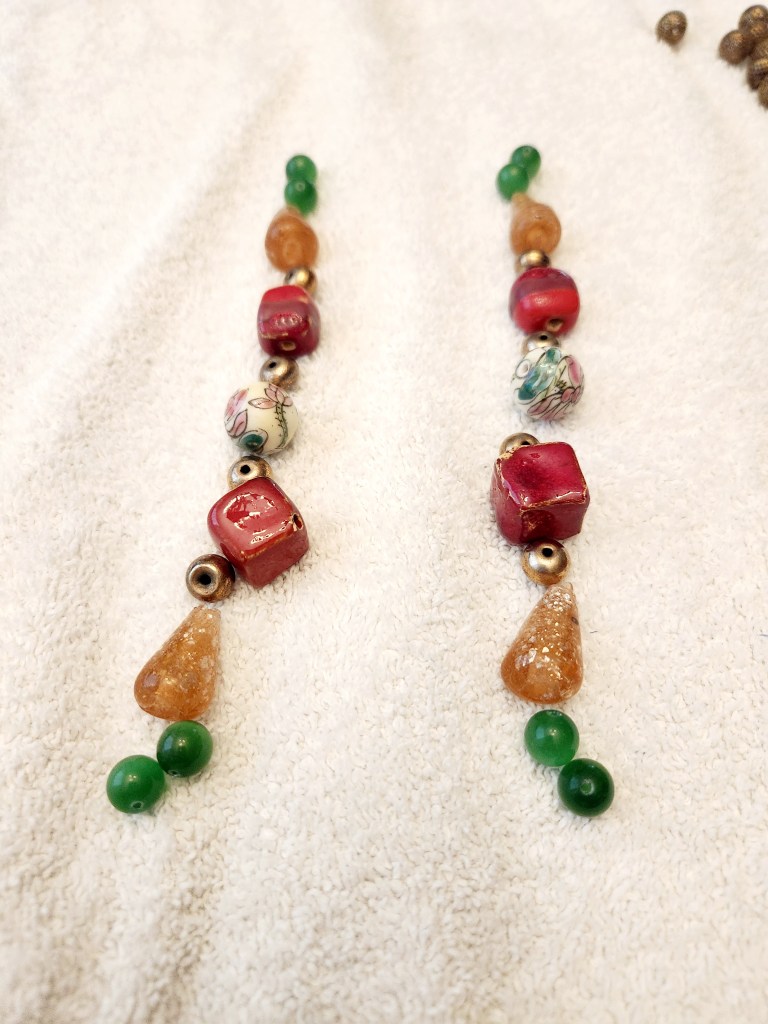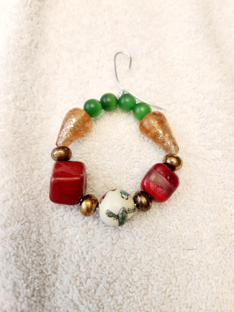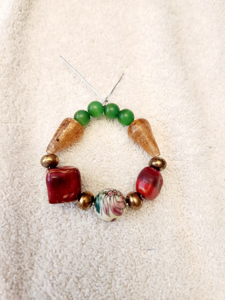 Step 2: Lay out your design. Keeping in mind that these are extremely unique and handmade beads from all over the world ( we mentioned before that our Grandmothers loved this stuff) they aren’t perfect for Christmas. But, by adding some filler beads from our local craft store we were able to add some Christmas flair to them. Just play around with your beads and see what works.