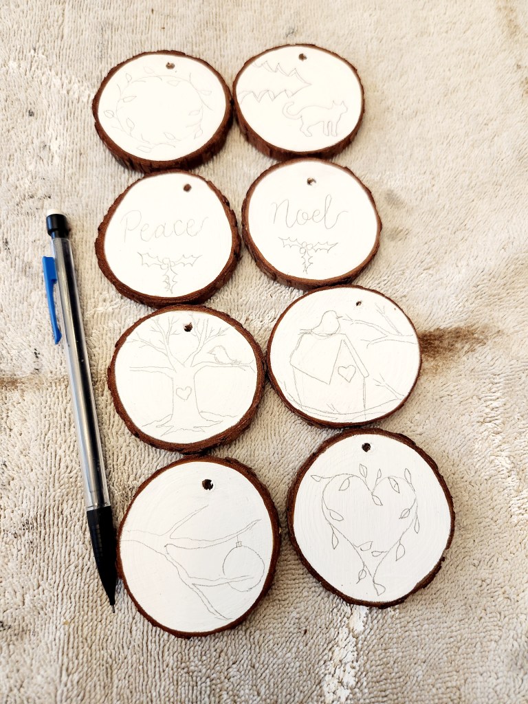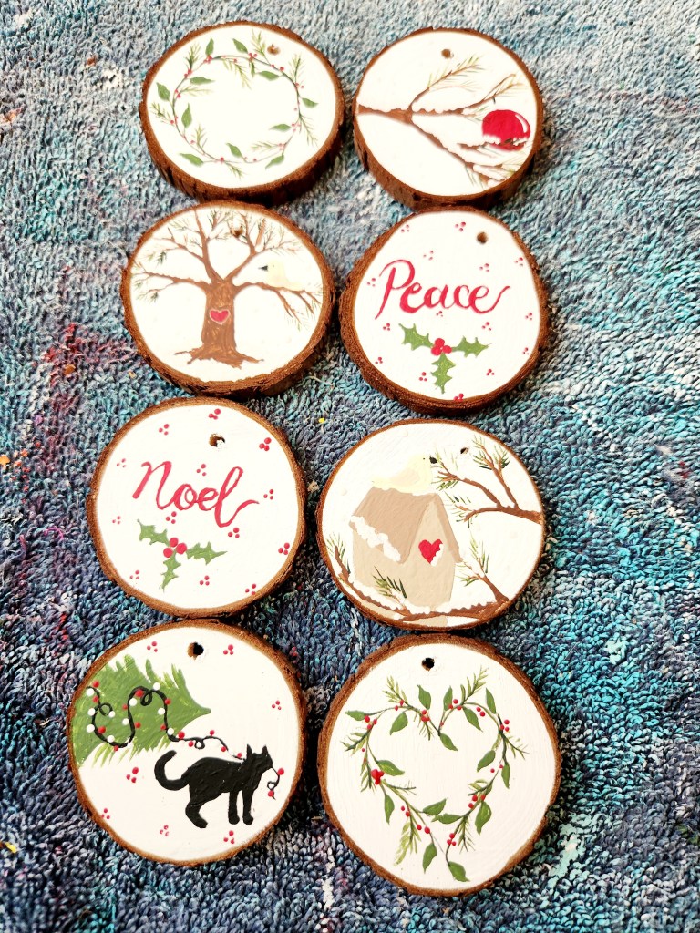 Step 5: Paint your ornaments. The possibilities are endless here. You could do them as simple or detailed as you like. You could even just do cute seasonally appropriate words such as Joy, Noel, Peace etc.