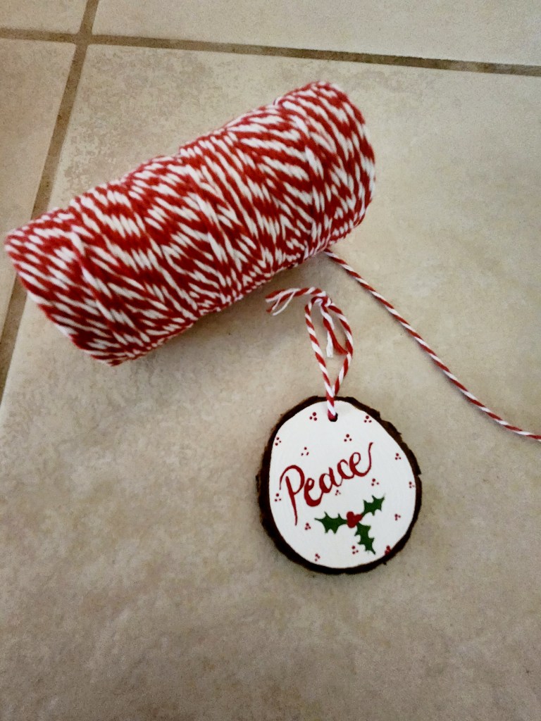 Step 6: Add your ornament hanger. We chose to use some red and white cotton string