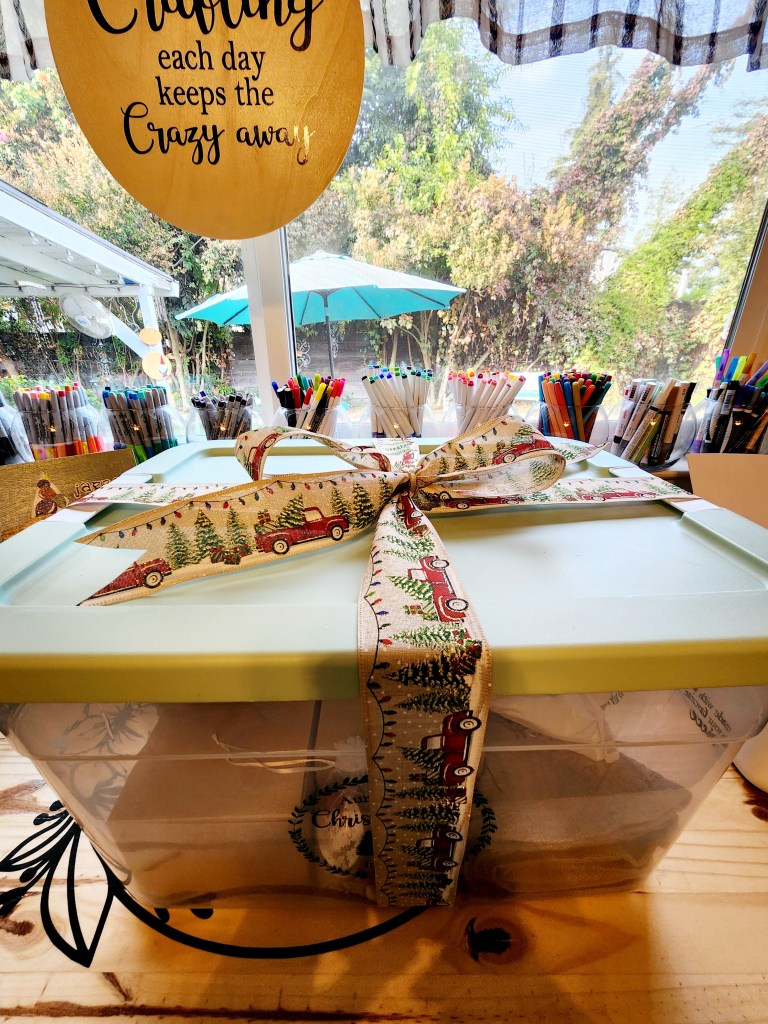 Step 4: Package everything into it’s box. We used our cricut machine to create some cute decal labels for the plastic totes. This is completely unnecessary but again, we are extra. We thought it added a nice personal touch plus is makes it more identifiable when it’s in a sea of other plastic totes.