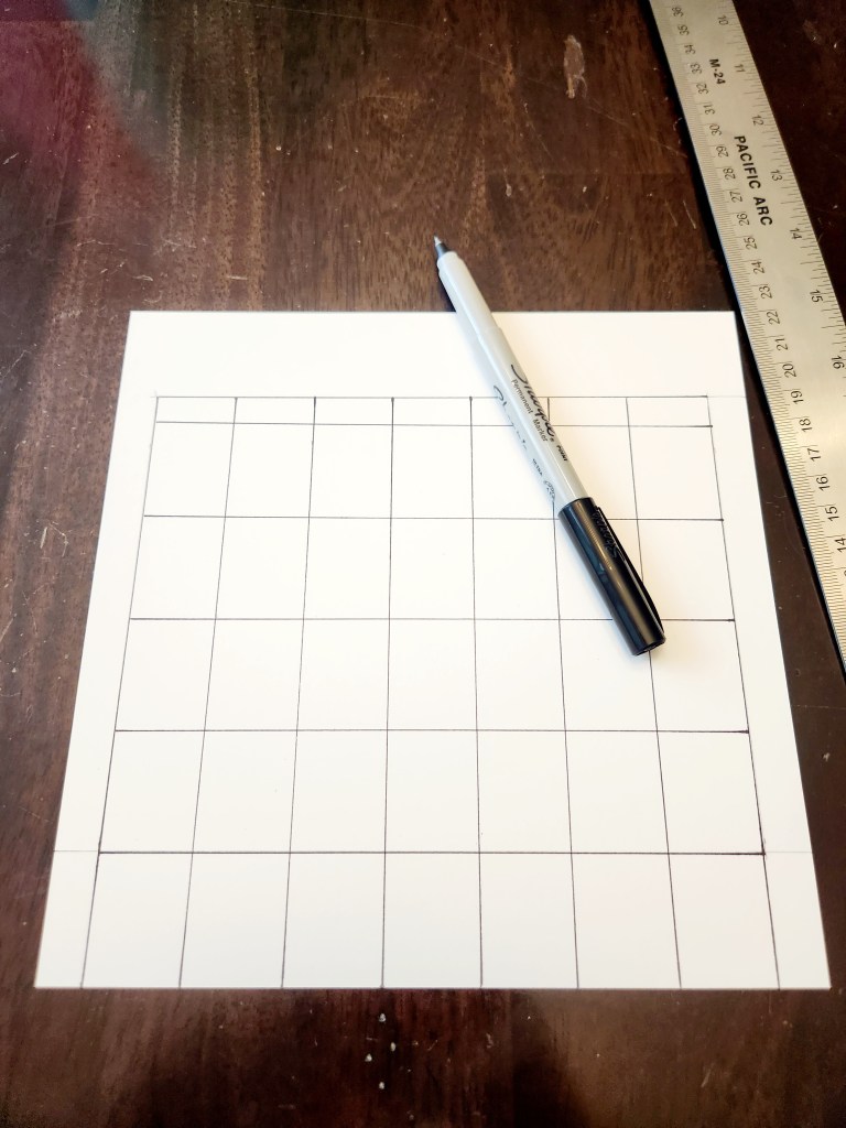 Step 2: Draw your grids. Depending on the size of your card stock figure out where all your lines need to be. They do have printable calendar options online but we prefer a more handmade look. You’ll need seven columns to the right ( Sunday through Saturday) and seven columns up and down ( five for the numbers, one for the days of the week and one for the month header.) We used pencil first and then went back over it with a fine tipped sharpie.