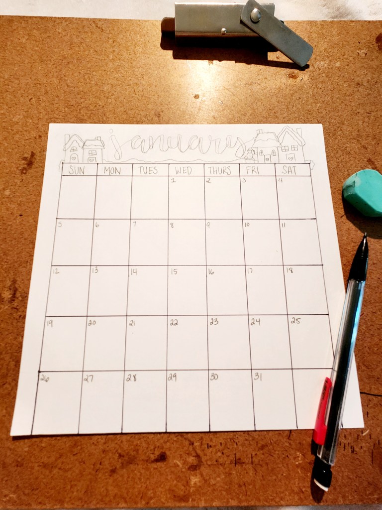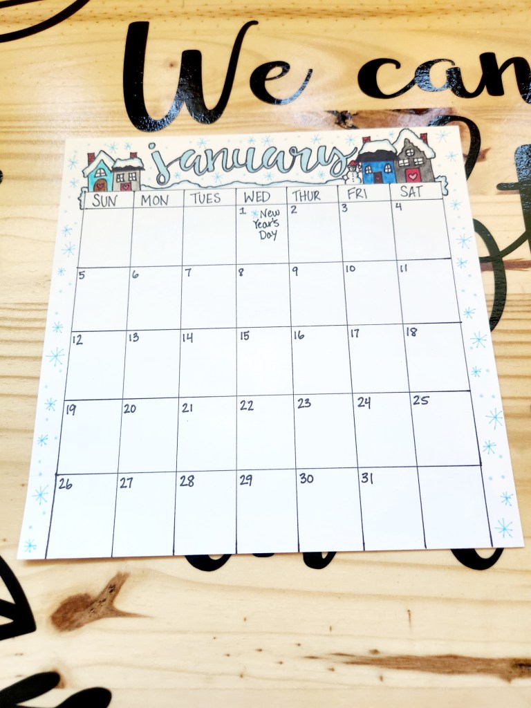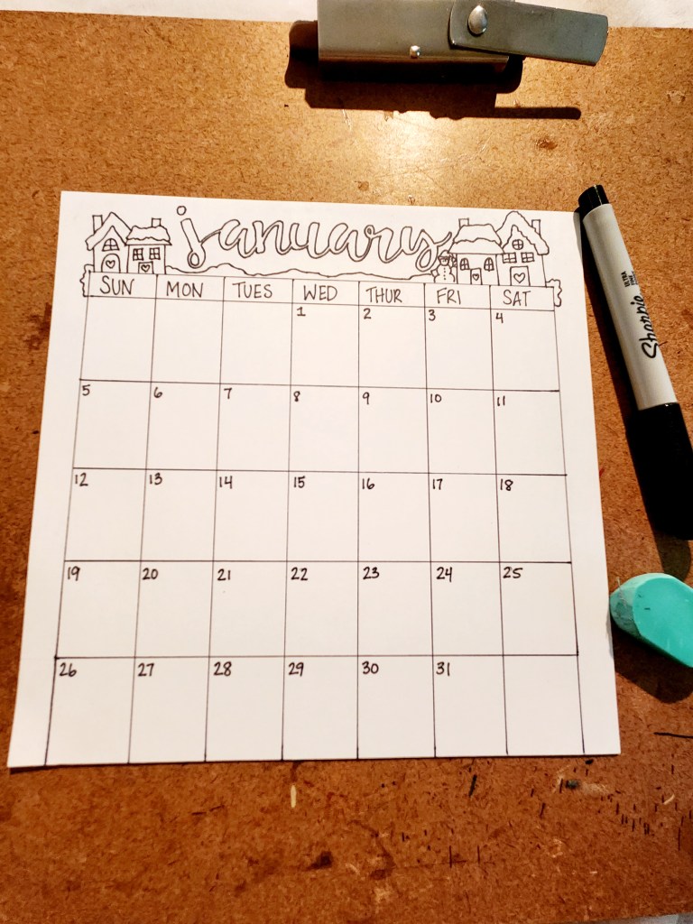 Step 3: Add your days of the week, numbers and month header ( January-December.) We again did everything in pencil first and then went over it with our sharpie. We also chose to add some coordinating decorations around the month to give the calendar some more interest. This is optional but we think it makes the calendar extra special. You can always go back and add more later. After everything is drawn on with sharpie erase any pencil lines.
