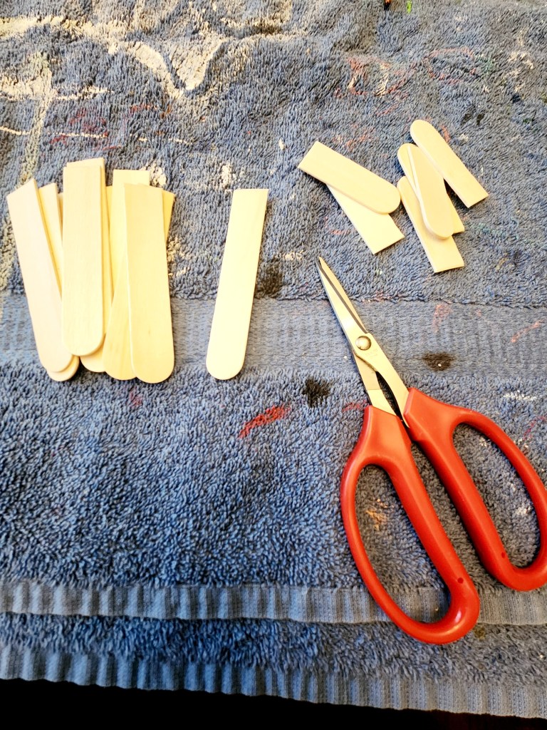 Step 2: Cut your Popsicle sticks to the size you’d like them to be. We wanted to use them as shingles for the top of our kissing booth. There is no wrong answer to this. Make them whatever size you think they should be to fit the size of your wooden rectangle.