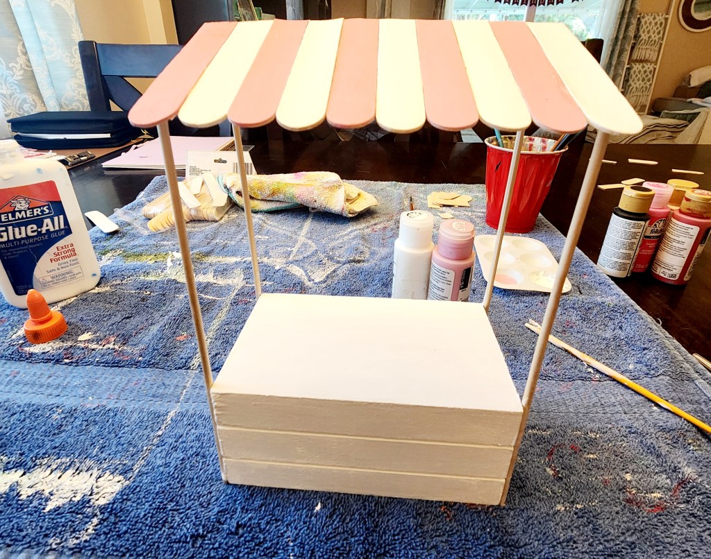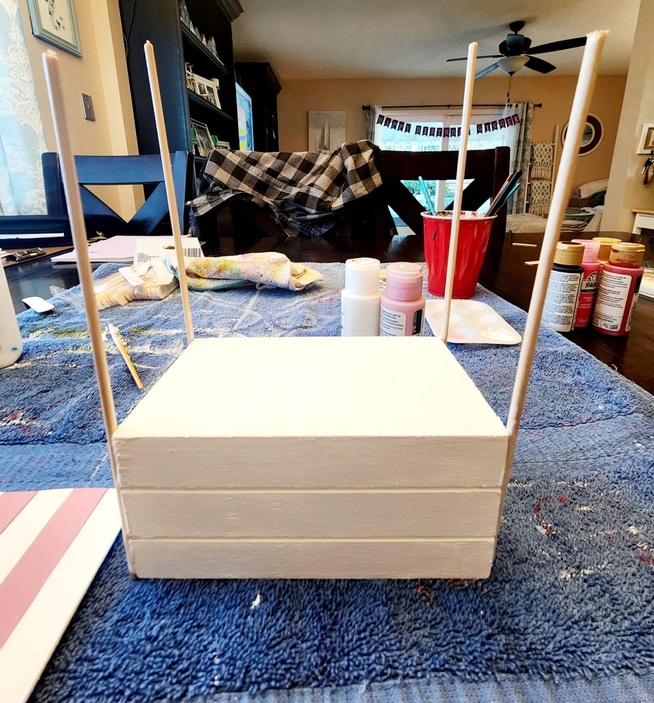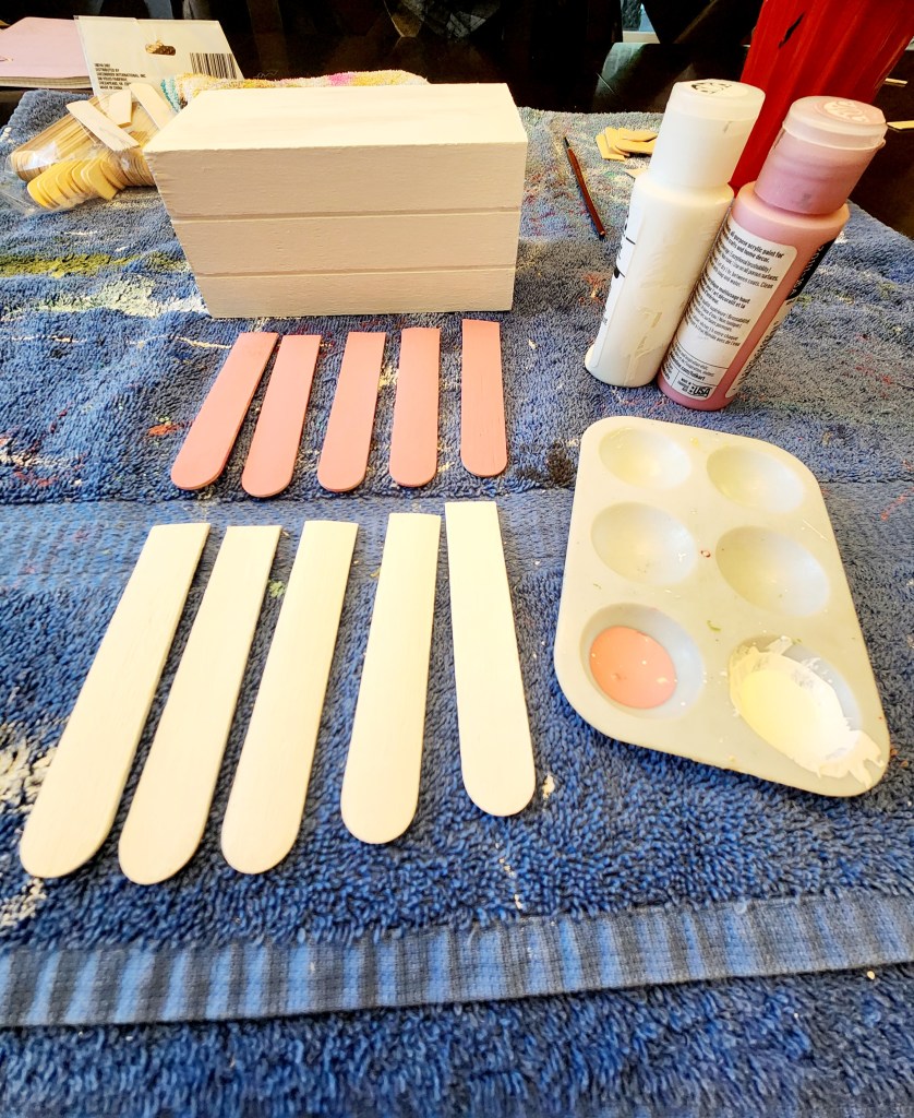Step 3: Paint your pieces. We painted half our shingles white and the other half pink. We didn’t bother painting our wooden rectangle because it wouldn’t be seen under our shingles. We also painted our small wooden box white. But, any colors work!