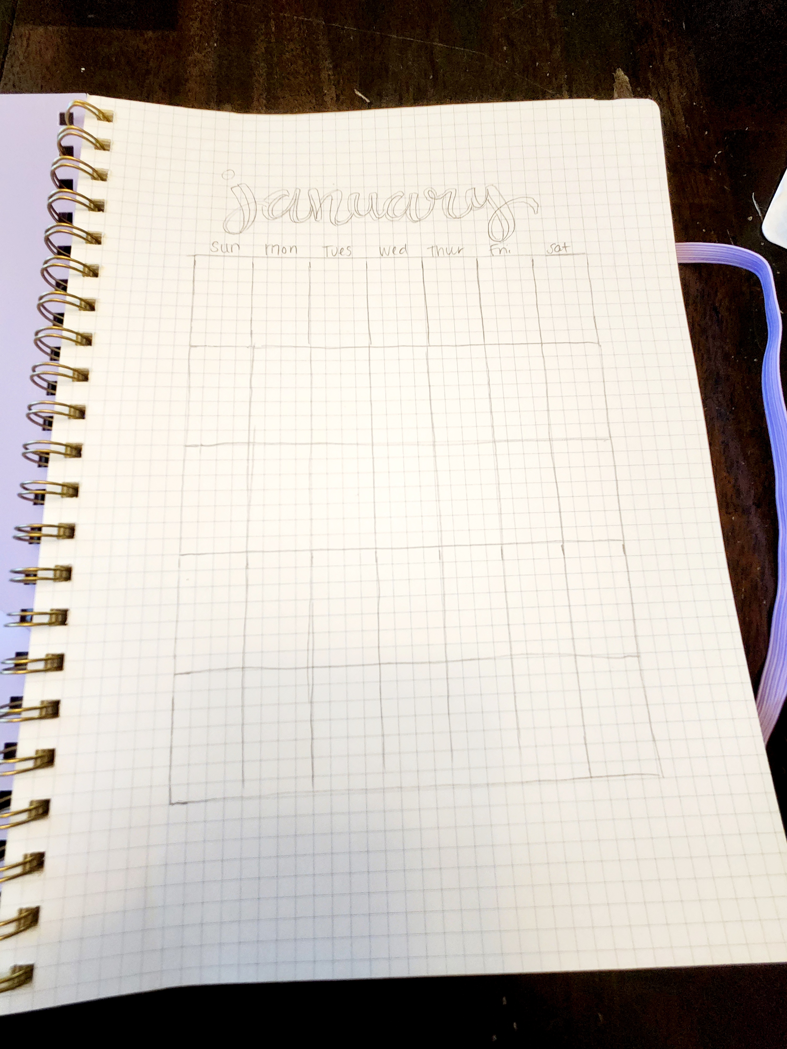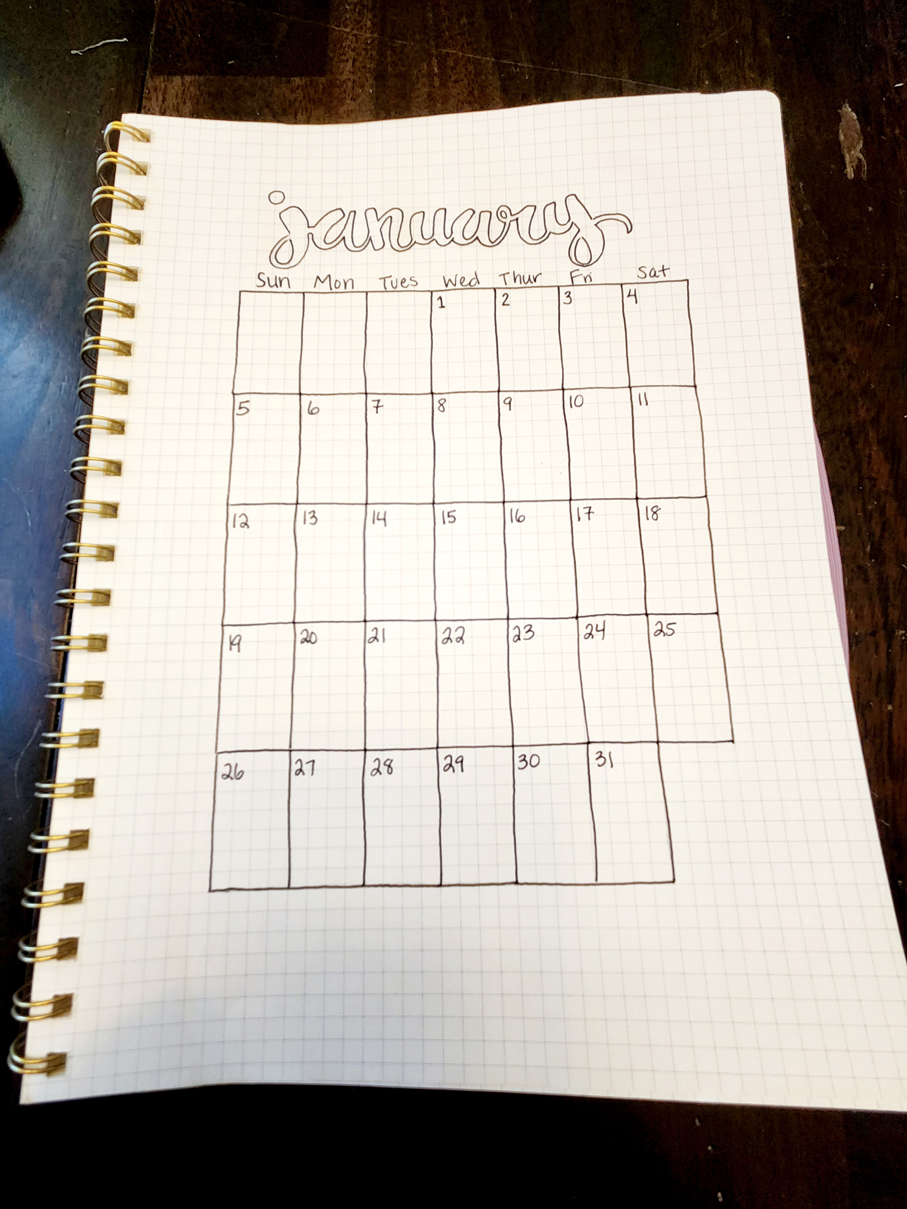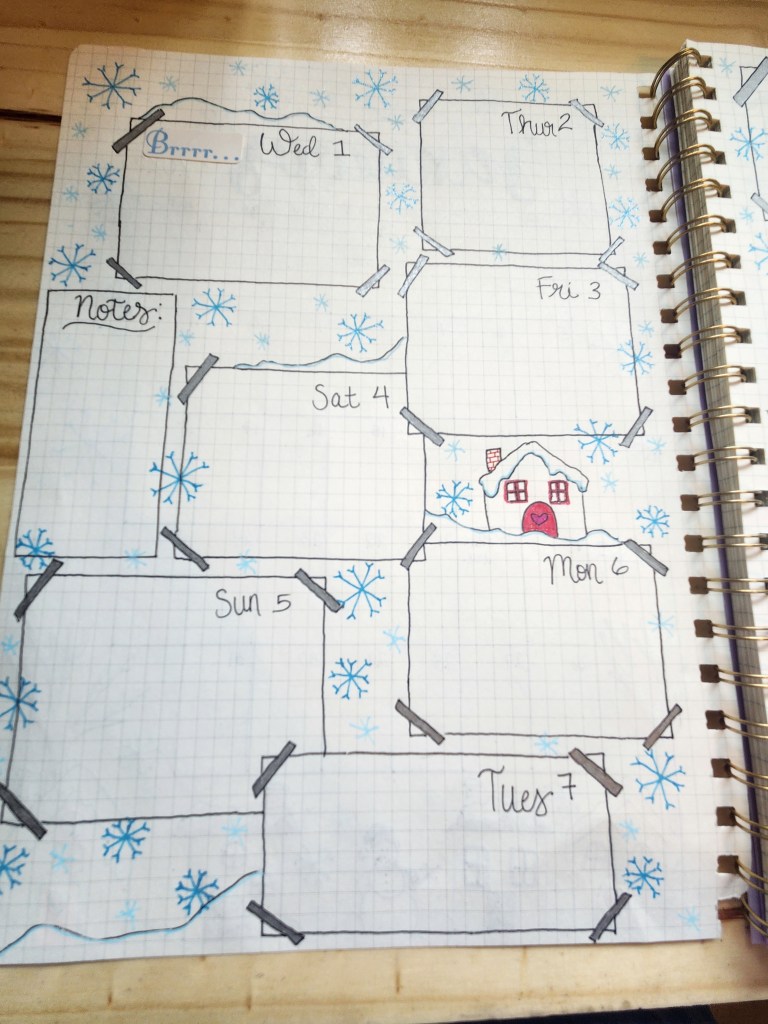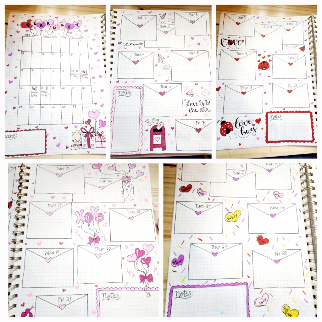 Step 3: Start your journal. We picked a journal that has graphed paper inside so we could keep things as straight as possible without having to use a ruler. But, if you’d like to you could certainly use one. We laid ours out by doing a full page calendar for each month followed by four pages for more detailed information. We used different shapes depending on the months design for a space to fill out that days events. For example for February we chose to do little envelops for each day of the week to fit in with our Valentines theme. We used pencil first just in case.