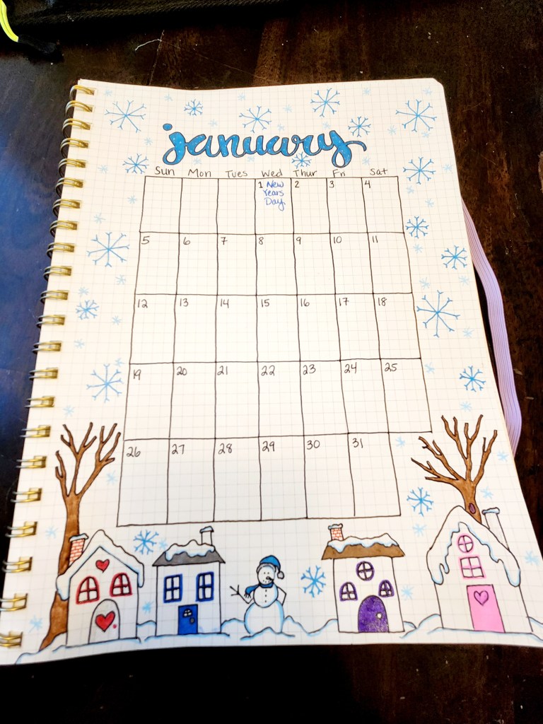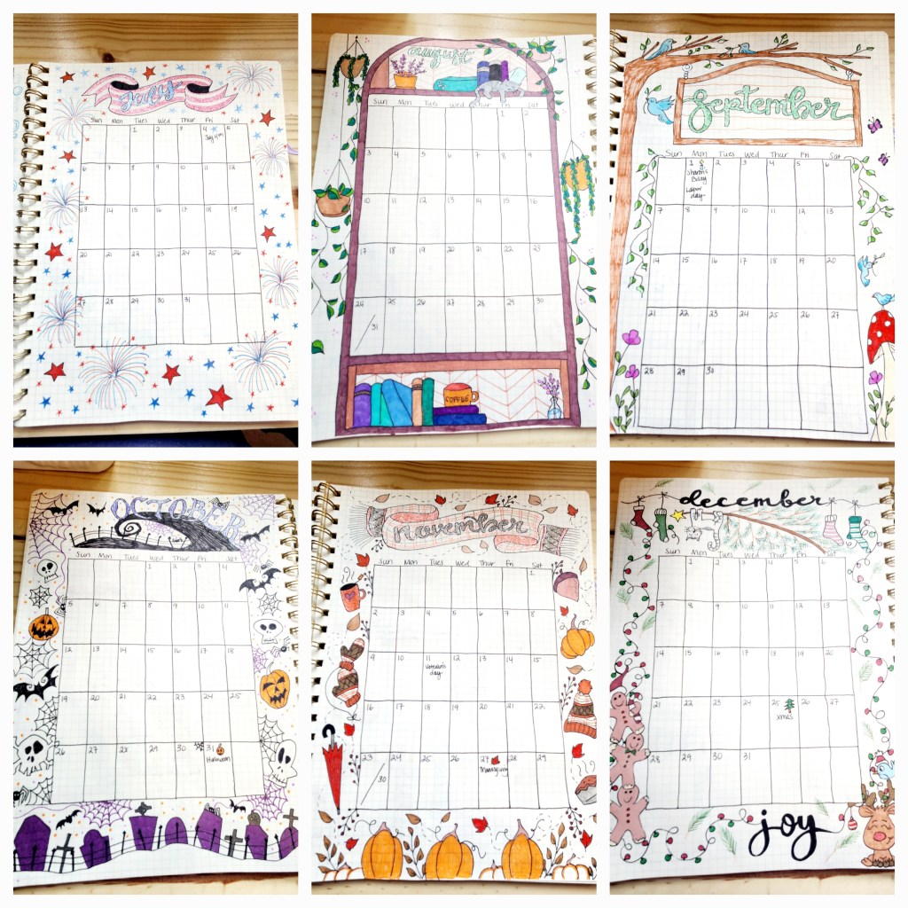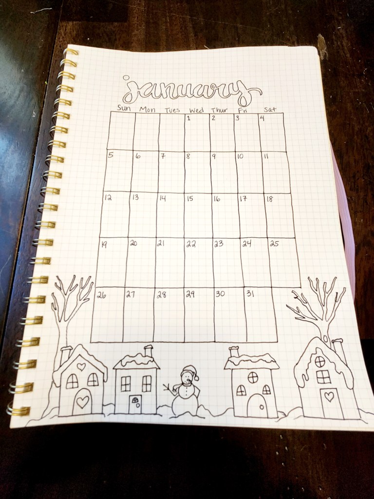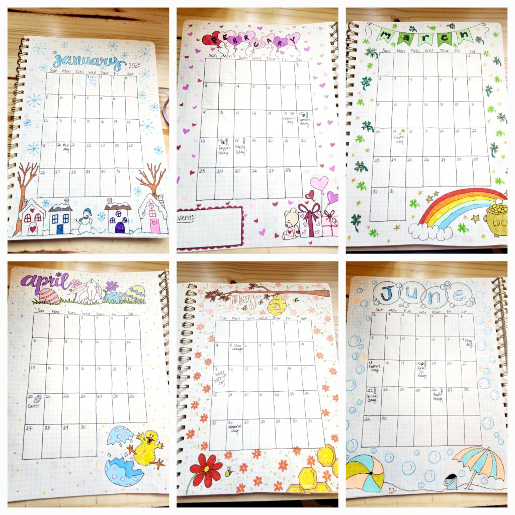 Step 4: Add your special touches. We love to draw so doodling comes naturally to us. We just used our imaginations to personalize each calendar with cute designs that fit in with each individual month. How much you do is completely up to you. You could even choose to decorate your journal as you go if you’d like to have something to doodle on throughout the year.