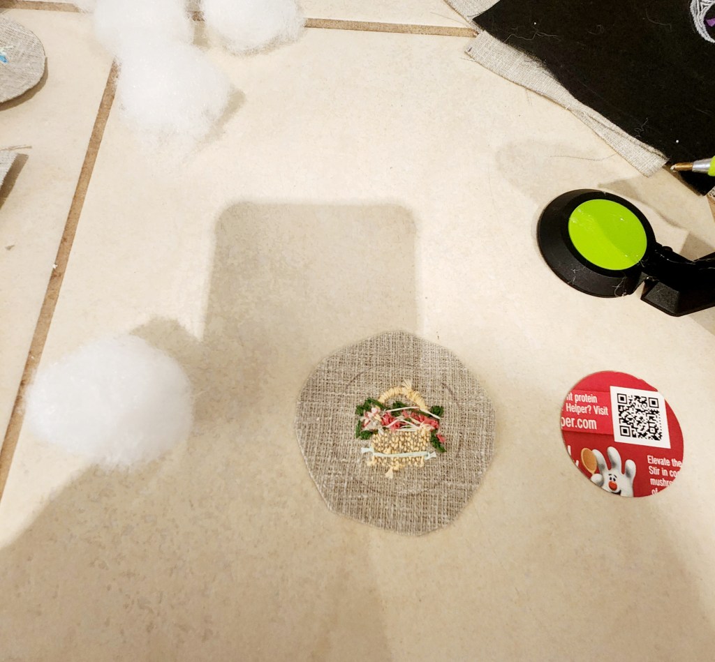 Step 7: Using a hot glue gun you are going to the glue your fabric to the cardboard circle and add a tiny amount of poly fill inside to create a little bit of cushion to the top of your compact. By folding the excess fabric all around the cardboard you will be sealing the poly fill inside and attaching the fabric to the cardboard at the same time. Make sure the front of your embroidery is facing out.