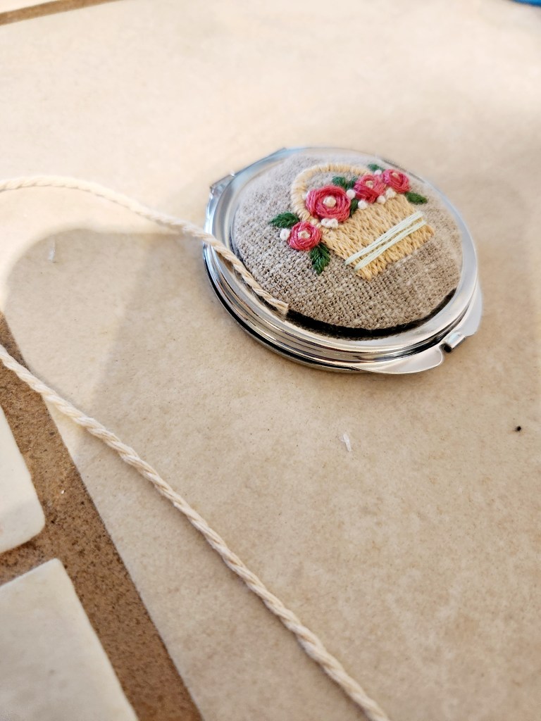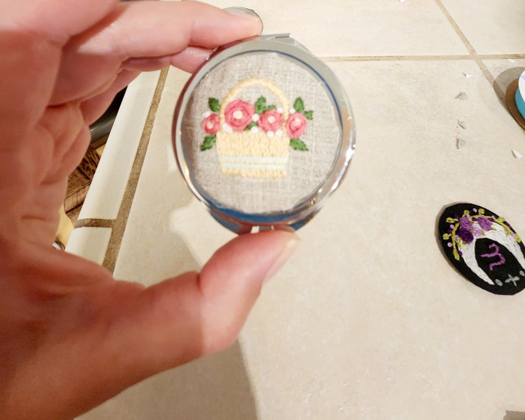 Step 8: Attach your embroidery to the top of the compact using your hot glue gun. Gently press down on the fabric to ensure it glues down evenly. Make sure your embroidery design is facing the right direction. Once it’s glued down it’s there to stay!
