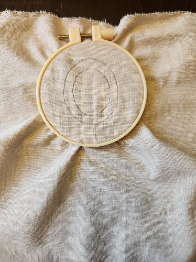 Step 3: Tighten your fabric inside your embroidery hoop. Trace your larger stencil with your heat erase pen first then trace your smaller stencil inside your larger oval centering it as much as possible.