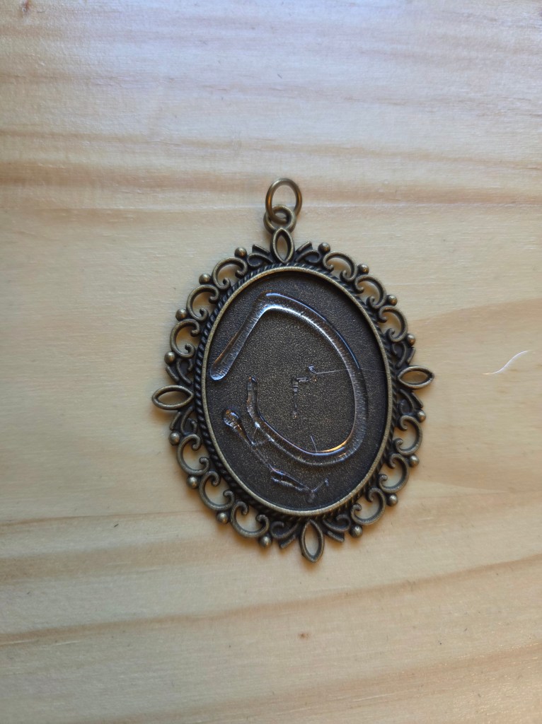 Step 9: Now it’s time to attach your embroidery to your pendant. We used hot glue for this. Put some glue inside the oval of your pendant. Gently place your embroidery over the glue and nestle it into place.